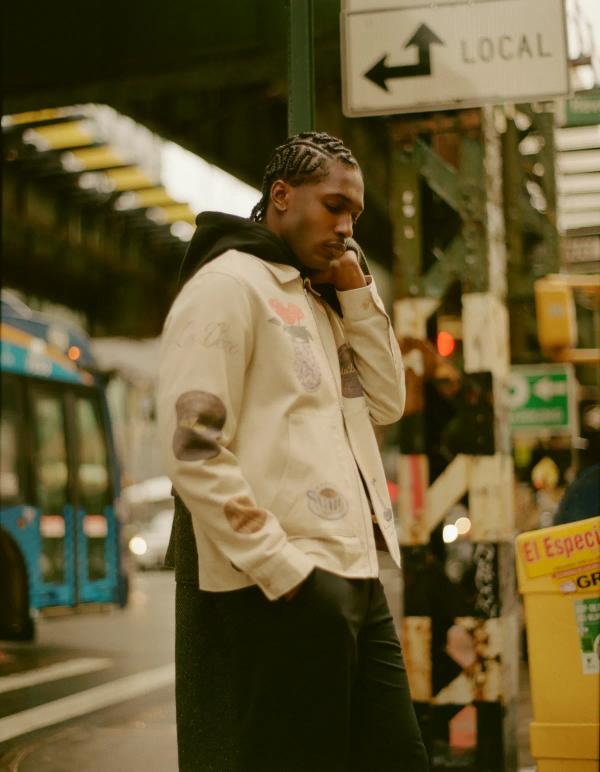 The result is a Midwest/Metropolitan clash. Practicality and blue-collar workwear meets the design universe he’s seen on the silver screen: white-collar workwear, boxy cuts, and bold graphics.